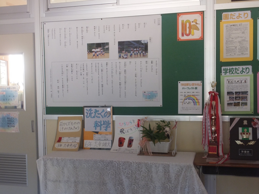 相撲4年準優勝と科学作品展(優秀賞1名、優良賞2名)の表彰がありました。科学作品3点は玄関に飾ってあります。
