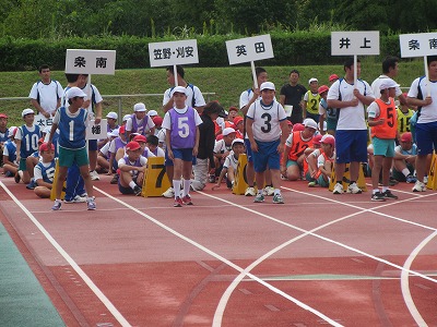 いよいよ対抗リレー。萩野台・笠野・刈安の連合チームで挑みます。