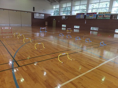 体育の学習です。先生が何も言わなくても、チャイムとともに体操スタート。そして自分たちで考えて、ハードルのコースを3つ作りました。