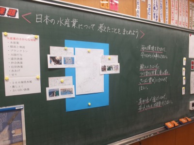 社会科です。スーパーマーケットで見つけた工夫について、自分の考えのわけをつけて伝え合っています。地産地消という難しいことばも覚えました。