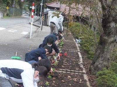 11/7の土曜日に雨が降り出したため、途中までになっていた花の苗植えを全校みんなでしました。