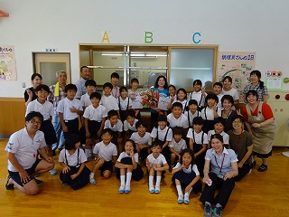 校長先生のお話の後、児童の代表がお礼の言葉を述べ、全校児童からの色紙とPTAからの花束をお渡ししました。