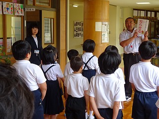 体育担当教師が、プールでのきまりや、事故のときの対応について話をしました。