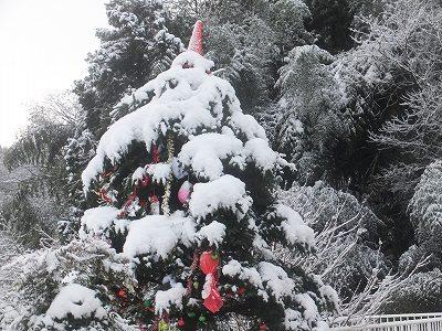 おとなりの寺尾保育園の立派なモミの木。クリスマス飾りも雪化粧です。