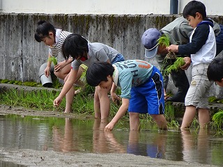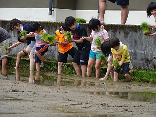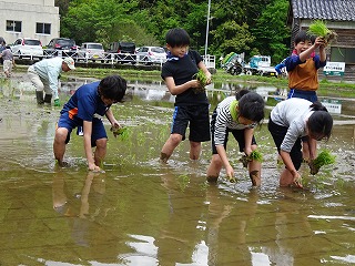 5月9日、米づくり体験活動として田植え体験を学校田で行いました。
