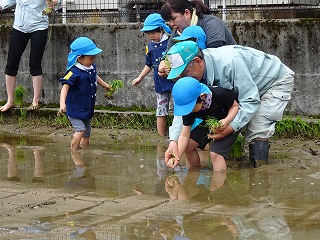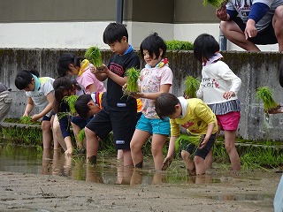 刈安小学校の児童25人と寺尾保育園の年長さんは、営農組合の方から苗の植え方を教えていただき、はだしで田んぼに入り、「かぐらもち」の苗を植えました。