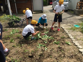 気温30度の今年一番の暑さでしたが、子供たちは花壇のまわりを土で汚さないように気を付けながら、しっかり作業を行いました。