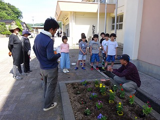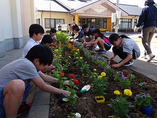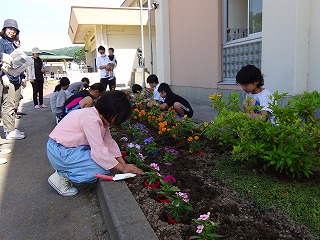 自転車安全教室の後行われた花壇苗植えは、16日に子どもたちが花の株を抜き、19日にはPTA環境部の皆様が雨の中整備してくださった花壇に、4.5年生のみどりの少年団がマリーゴールドやインパチェンス、日々草など6種類の花の苗を植えました。