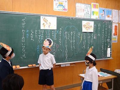 1,2年生。1年が演じたおむすびころりんのビデオを見て、2年生がアドバイス。
