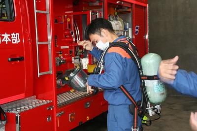 ホースはなんと30メートルほどものびるそうです。非常ボタンを押すとポンプが作動開始します。