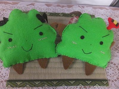 倶利伽羅峠の歌(音符)のついている「メ―ちゃん」と源氏太鼓のばちと刈安ソーランの鳴子がついている「リーちゃん」 ふたり合わせて「刈」、刈安の刈になります。