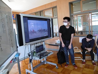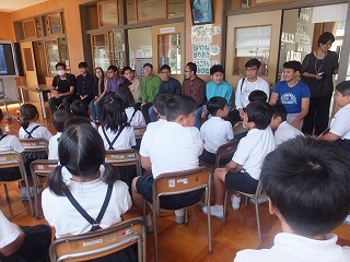 子供たちは英語で自分の名前と好きな物を話し、自己紹介をしました。その後、留学生の皆さんの話を聞いたりマレーシアやモンゴルの遊びをしたりして、交流を深めました。
