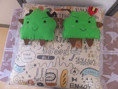ゆるキャラのメーちゃん、リーちゃんが ふかふかのクッションで