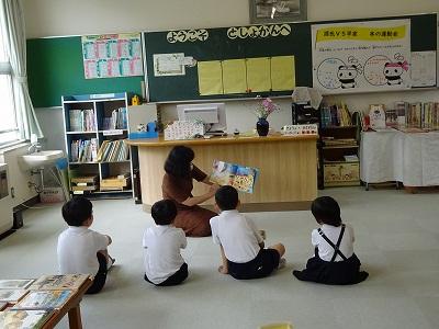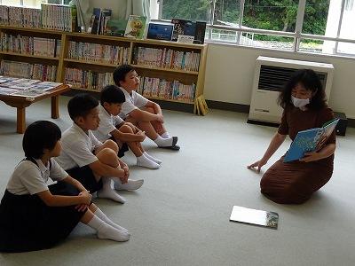 図書館の先生の来校日、今朝は3,4年生が読み聞かせをしていただきました。