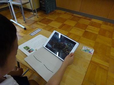 タブレットを使って教科書のQRコードを読み取り、今 学んでいるところの動画をチェック。