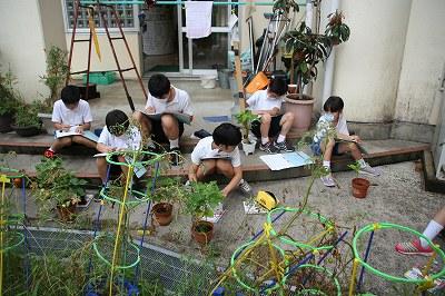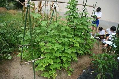8/31 3,4年生が総合の学習で、おまん小豆と いけなら紫を育てています。