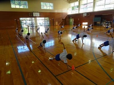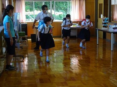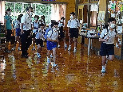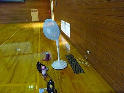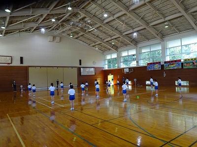 体育館での運動会練習もスタートです。扇風機を4台まわし、水分補給をしつつ進めます。