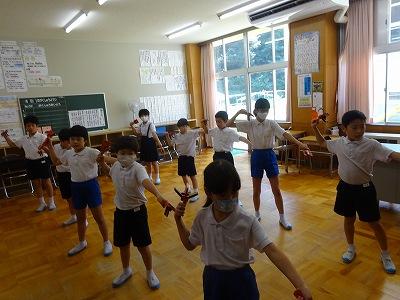 源氏と平家に分かれて、運動会の応援歌稽古。高学年が歌詞を考え、アンパンマンなどの