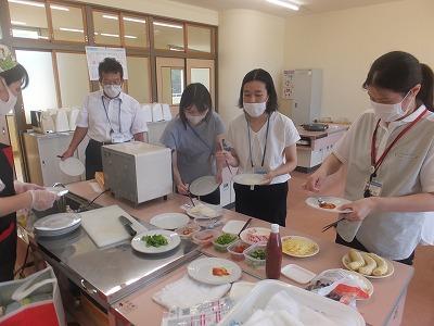 講師は本校のN先生。材料は、刈安小の畑でとれたオクラ、ピーマン、ミニトマト、あとはケチャップ、チーズ
