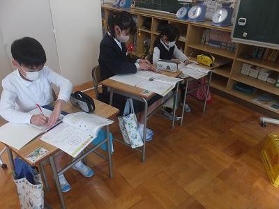 算数もがんばっています。図と式をつなげます。2年生は九九のしあげ。4年生は色々な四角形の対角線調べ。