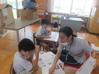 雨模様の朝。学生サポーターの先生にも助けていただき、ドリル学習。