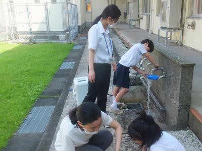 めだかの水槽のおそうじ。担任の先生と学習サポーターの先生とともにがんばっています。