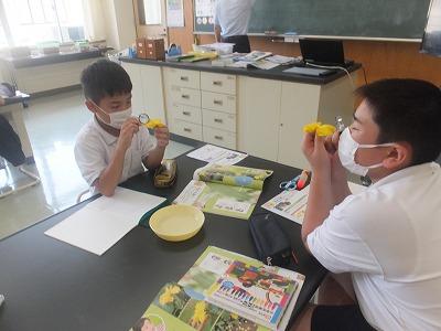 へちまの雄花を観察する5年生。おしべの様子をじっくりと。