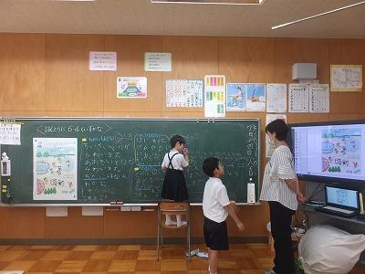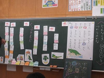 1年生「は、へ、を」などのくっつきもじ(助詞)を使って、文の文ちゃんと仲良しになりました。