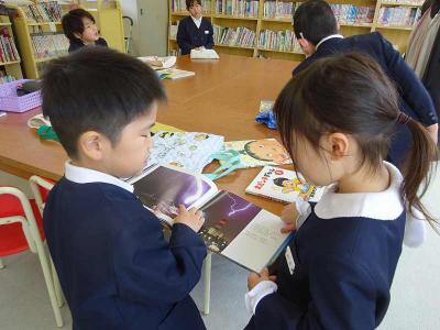 友だちと仲良く本を読んでいます。