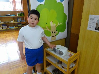 【校歌】全校で元気な声で校歌を歌いました。3年生の放送係さんが、CDデッキを操作して伴奏を流してくれました。