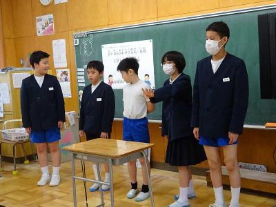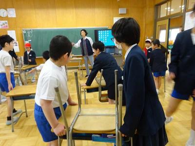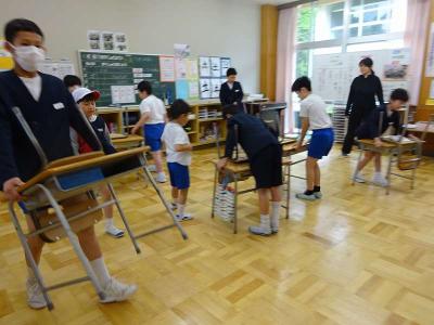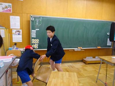 【後片付け】集会後の片付けも、率先してできました。中学年と高学年が力を合わせて机を運ぶなど、協力しながら行っています。