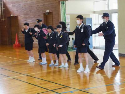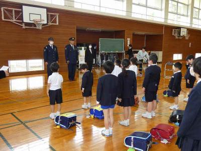 「いかのおすし」を確認し、ランドセルをつかまれた場合の逃げ方、子ども110番の家に助けを求める方法などの訓練を行いました。