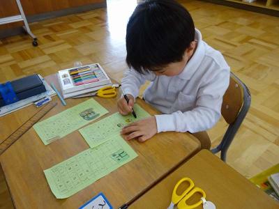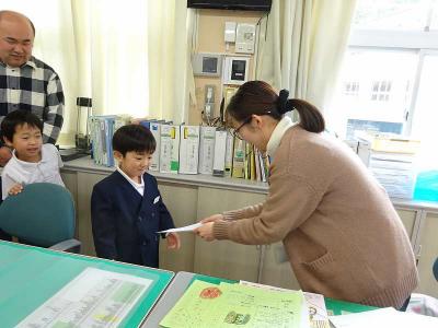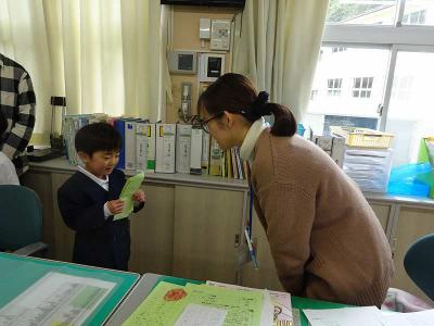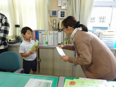 【1年生】自己紹介カードを書いて、校内の先生方と名刺交換しました。好きなものも上手に伝えることができました。