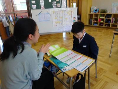 【2年国語】「ふきのとう」のお話の様子を思い浮かべながら読んでいます。1年生に音読を聞いてもらうのがめあてです。