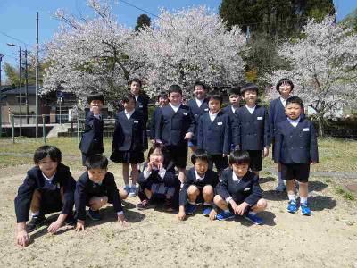 満開の桜の木の下で、全校写真を撮りました。元気いっぱい・なかよしの刈安っ子です。