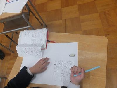 こちらは4年生、総合・上野のため池についての資料をまとめ中。仕上がったらゲストティーチャーに見ていただこう
