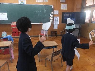 こちらでは、児童集会にむけて「桃太郎」の劇のリハーサル中。本番が楽しみです。