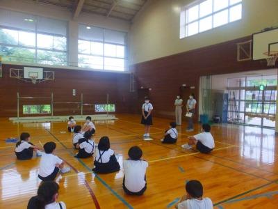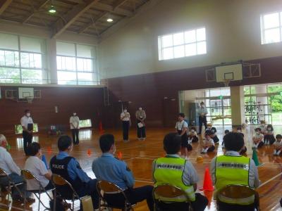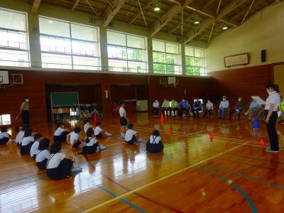 場所を体育館にうつし、交通安全教室です。学校安全委員会の皆様に加えて、津幡町交流経済課よりお二人、津幡警察署よりお一人がお越しくださいました。