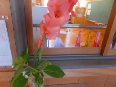先生からのお話。「今まできれいに学校を彩っていてくれた花たちに「ありがとう」の気持ちで抜きましょう」
