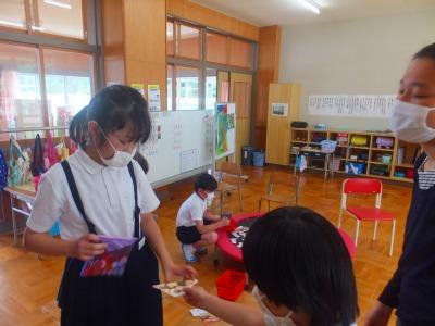 長休み。輪投げコーナーやお店コーナーに友だちが来てくれて楽しいひとときです。