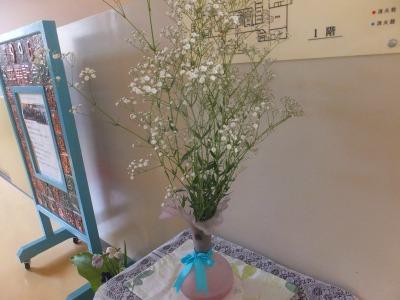 玄関は花壇に植える花でいっぱい。校務員さんがさっそく植え始めてくださいました。