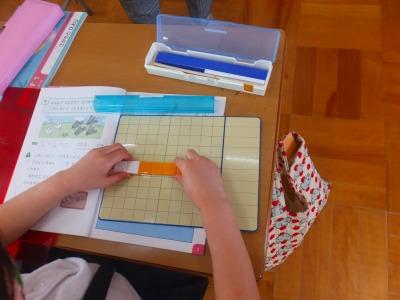 こちらは 2年生。デジタル教科書を使って、ものさしの正しいはかり方を説明しています。