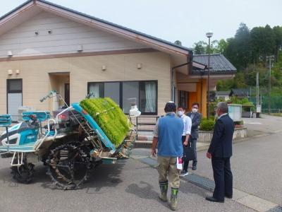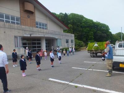 例外的登校の児童と、寺尾保育園の登園児のみなさんとともに、機械での田植えを見学