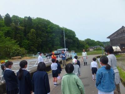 5/15  オンライン朝の会の後、10時から地域の皆様(田んぼの先生方)に、田植えをしていただきました。