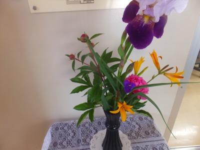 美しい花。本校職員のおうちの庭からいただきました。