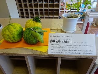 中国原産の果物で奈良時代に日本に入ってきたそうです。名前は柚子となっていますが、ブンタンの仲間で、姿が獅子のような形をしているのでこの名前がつきました。正月に玄関に飾ったりするのに使われ、食用より観賞用の果物です。