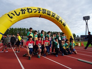 11月3日、いしかわっ子駅伝交流大会が西部緑地公園陸上競技場で行われました。刈安小学校からは5年生女子1名が笠野小学校との合同チームで、5年生男子2名が記録会に参加しました。