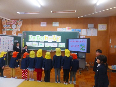 12/19 1,2年生が寺尾保育園の年長さん・年中さんをお招きして「いきものわーるど」を行いました。