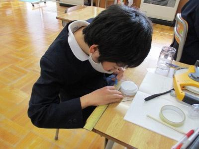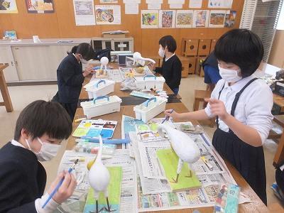 瓢箪で鶴の親子作っている4年生。先日 瓢箪の先生にお習いしたことを