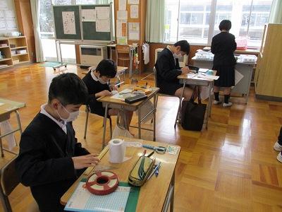 5年生は、身のまわりのまるいものを見つけて、直径と円周を測り、調べ中。